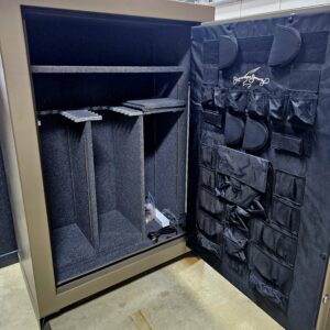The AMSEC SF6042 safe is a robust security solution, featuring a fire rating of 60 minutes at 1200°F, dual door seals for fire and smoke protection, and a 3/16″ steel plate door with a 12-gauge steel body. It includes fourteen 1-1/4″ solid steel locking bolts, an electronic lock, and a textured gunmetal gray finish. The safe is designed to hold up to 44 guns and comes equipped with a LED light kit, dehumidifier rod, and a premium door organizer.
